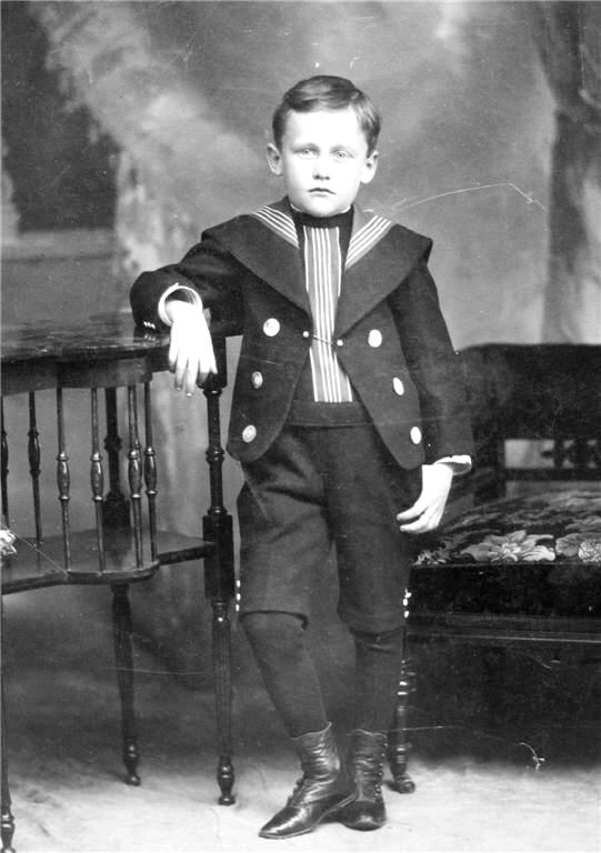 The classic pull-over middy blouse is generally associated with the sailor suit. We note, however, a wide range of sailor garments which button up thefront. We note garments that were very similar to pull-over blouses and others that seem more like jackets. Some were very similar to middy blouses and also blouced at the waist, perhsps using a draw string. We are not entirelt sure how this would have been done. Perhaps it just bloused out a bit when tucked in to the waist. A good example is English boy Harry Shaw. He wears a button-up middy blouse. Many of these button-up middy blouses could be worn with standard dickies.