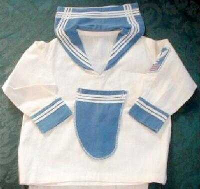 This dickey was similar to a vest. In fact we are not sure if it was called a dickey at the time. It was made to be worn with sailor blouses or jackets that were worn open. Many early sailor blouses buttoned up the front or had ornamental front buttons. These were designed to be worn somewhat like a Fauntleroy suit so as to show off a garment worn under the blouse or jacket. These vest-like garments for sailor suits common had an embroidered nautical device. They were commonly worn as a suit abnd made in the same material as the blouse/jacket and pants. It differed from a vest as it was not done with a "V" front, but had a crculasr form around the neck, similar to a dickey.