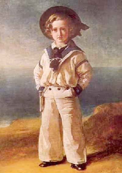 It was Queen Victoria's son, Prince Albert Edward--the FutureEdward VII, who in 1846 first wore a boy's sailor suit. It was based on the uniorm of the British enlisted seaman. It proved a great success. Parents thought the style charming. It also had the happy coincidence that boys in England and other countries wanted to wear a salor suit. It was also a swerd political step. No institution in Britain was as popular and respected as the Royal Navy. The monarch in England as a result of the preformance and personal beavior had fallen on disrepute. Victoria and Albert had set out to rebuild the prestige of the monarchy. Associating the monarchy and the heir apparent with the Royal Navy and especially the enlist ranks was a stoke of political genius of the first order. I am not sure just whose idea it was. It sounds more like Albert's work than Victoria's, but perhaps an advisor firsrt conceived of the idea.