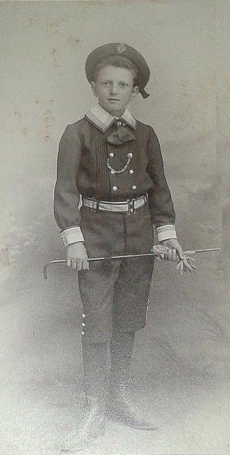 This Belgian boy in 1908 wears a dark, probably blue sailor suit. It had traditional collar styling. but no matching cuff trim. He wears more of a front buttoning jacket than a middy blouse. With the dark suit it is difficult to detect any of the detailing of the suit. His dickey is quite high and matches rather than contrasts with the jacket. He wears rather long cut knee pants with short datk socks and high-top shoes. He looks to be about 7 or 8 years old. He has long hair done in a kind of top curl.