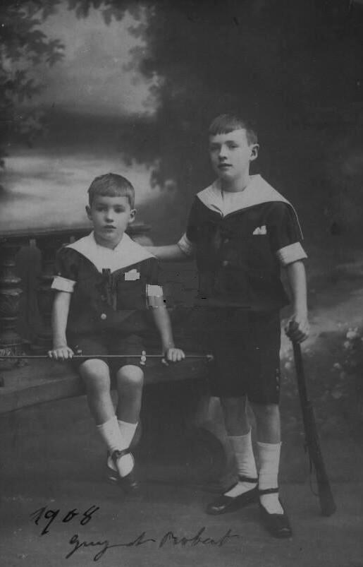 Here we see two brothers wearing matching knee pants sailor suits in 1908. One of the boys seems to be named Guy, we can't make out much of the remaining text, perhaps it is Robert. The middy blouses have short sleeves. That was not very common in the 1900s. Presumably they are summer suits. They look to be blue suits with white collars and dickies along with coordinated white sleeve cuffs. They also wear three-quater white socks and ankle strap shoes. The bots look to be about 4-8 years old. The boys also wear similar bangs hair cuts.