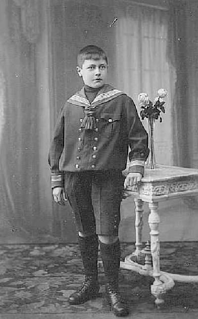 This Belgian boy was photographed during World War I in 1915, although there is no sign of the War in the portrait. He looks to be about 14 years old, perhaps even 15. He has a dark presumably blue sailor suit. It has a rather distinctive middy blouse with a double row of buttons and a flap breast pocket. The trim is rather traditional, but there appears to be 4-5 stripes rather than three. His dickey is a plain dark one, looking almost like a turtle-neck sweater. The scarfe is tied into a knot and fans out below the knot. We notice this knot style quite commonly in Belgium. His kneepants have the traditional three button trim. He has dark kneesocks and high-top boot-like shoes. Notice his short hair, but with a front fringe. There is no indication as to what style hat he wore with his sailor suit.