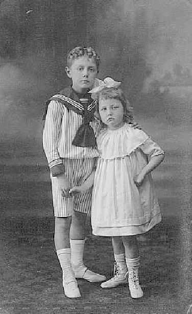 This Belgian boy and his sister were photographed in 1917 (figure 1). He looks to be about 10 years old. He wears a stripped short pants sailor suit with traditional styling. He has traditional three-stripe detailing. We have noted some Belgian boys wearing suits with 4 olr even 5 stripe detailing. This would have been a summer sailor suit as it is made in a light color. Usually the white suits were for the summer. I'm not sure what color the stripes or the neck and cuff detailing were. His scarfe knot is tied in the middle and the sacrfe than fans out below, a style was have noted on Belgian boys wearing. He has white three quarter socks with white strap shoes. His sister wears a fashionable hair bow and very wide collar. It is difficult to tell, but she might have a smock over her dress. She wears high-top shoes rather than strap shoes like her brother. Both wear white socks. We do not know what type of hat he wore with his sailor suit.