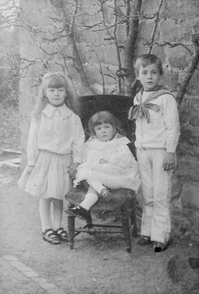 There are a range of sailor style elements used on a range of sailor garments. These are not garments, but elements used with sailor garments and styling. Sailor headwear had tallies like the shop tallies worn by Royal Navy sailors. Another element was the streamers on sailor caps and hats. These were not exclusive to sailor headwear, but were strongly associated with it. This gets a little confusing because wide brimmed-sailor hats became worn by boys and girls even when not wearing sailor outfits. We also notice the streamers on Scottish bonnets, but are unsure at this time as to any connection. Surely the most important element was the destinctive V-front sailor collars used on blouses and other garments. They were done in a wide range of styling and detailing. Another element was bows or scarves used with sailor collars. Notice the bow the boy here has (figure 1). This is one way of differentiating English and German sailor suits. There was also the back flap added to the V-front collar. There were also coordinated sleeve cuffs like the boy on the main English sailor sit page. The boy here does not have the collar detailing repeated on his sleeve cuffs (figure 1). Both the V-collar and cuffs could vary quite a bit. Another important element is the bellbottom feature on some long pants sailor suits.