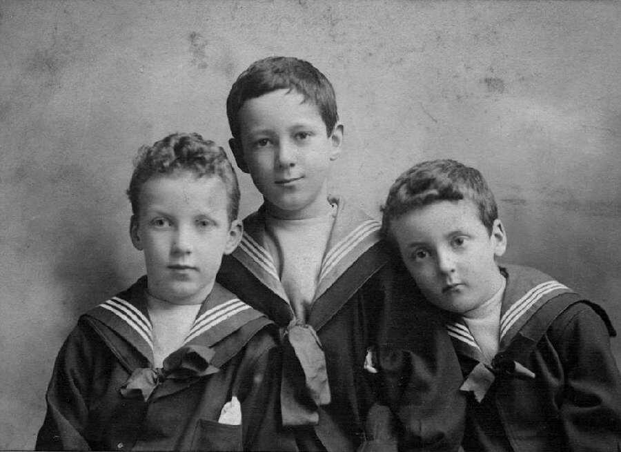 This studio cabinet card portrait shows three unidentified brothers in identical traditional sailor suits with the three stripe detailing. The dickies are plain. The bows are more like ribbons and easy to destinguish from the German style. The blouses seem to button up, but we do not see the buttons. The boys have nandkerchiefs in their breast pockets, but no lanyards and whistles. Note rhat there are two back flaps. The striped collar is lais ovr an existing collar. They boys look to be about 4-9 years of age. As there are three brothers, there needs to be about a 5-6-year range. Unfortunately the portrait is undated. We would guess it was taken in the 1900s, but we are not sure about dating English cabinet cards. The Late 1890s or early-1910s are possibilities, The studio was R. H. Carling in Stockton on Tees.