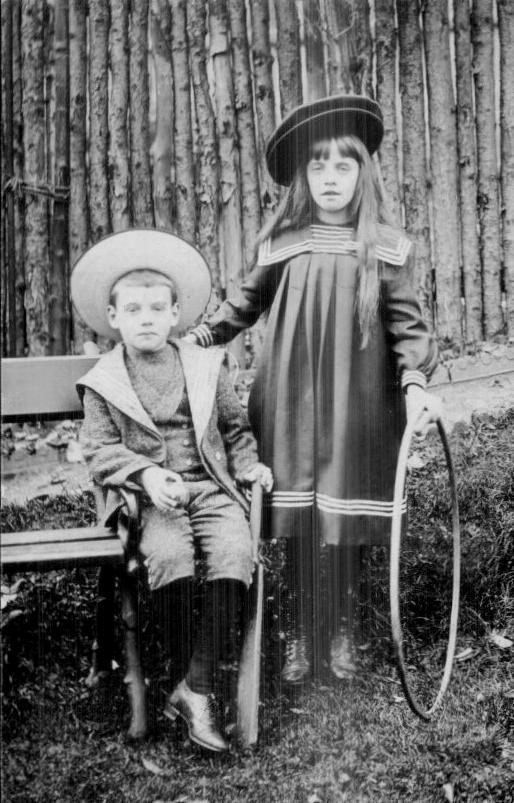This British half-penny postcardback portrait shows a brother and sister out for a park outing dressed in differently styled sailor outfits. They look to be about 8-11 years old. The headwear is especially interesting. The boy wears a classic broad-brimmed sailor hat. His big sister we are not entirely sure about, but would guess it was a large tam. The boys wears a jacket rather than a blouse sailor suit with knee pants. His sister wears a sailor smock frock with no defined waistline. Both children wear black long stockings and low cut shoes. These are all fashions American children could have worn--except the low-cut shoes. American children mostly wore high-tops. This is not a studio portrait, but the professionl posing suggests to us that it is not a family snapshot. The bench suggests a park scene, although the tree trunk wall seems strange for a park. Perhaps a street-type photographer set up shop in the park. The portrait is undated, but we would guess was taken in the 1900s. We have seen this style of sailor suit referred to as admiralty jackets . We notice this reference in American catalogs. This may have been the same in England. British Admirals around the time of Napoleon wore jackets that are similar. They seem to have been prticularly popular around the turn-of-the 20th century.