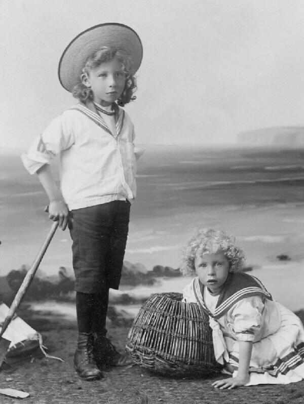 It was quite common by the 1890s for parents to dress whole families, including brothers and sisters in sailor outfits. Here the boy wears a middy blouse with kneepants and the girl a sailor-styled dress (figure 1). The styling of the sailor collar is similar. The boy looks to have a red collar and the girl a blue collar. We are not sure where this portrait was made, but Dover seems likely because of the backfrop. Studios in resort towns commonly offered portraits like this to tourists taking a family seaside vacation. After the turn-ofthe century we begin to see photographs actually taken on the beach, but we still see studio portraits like this for some time.