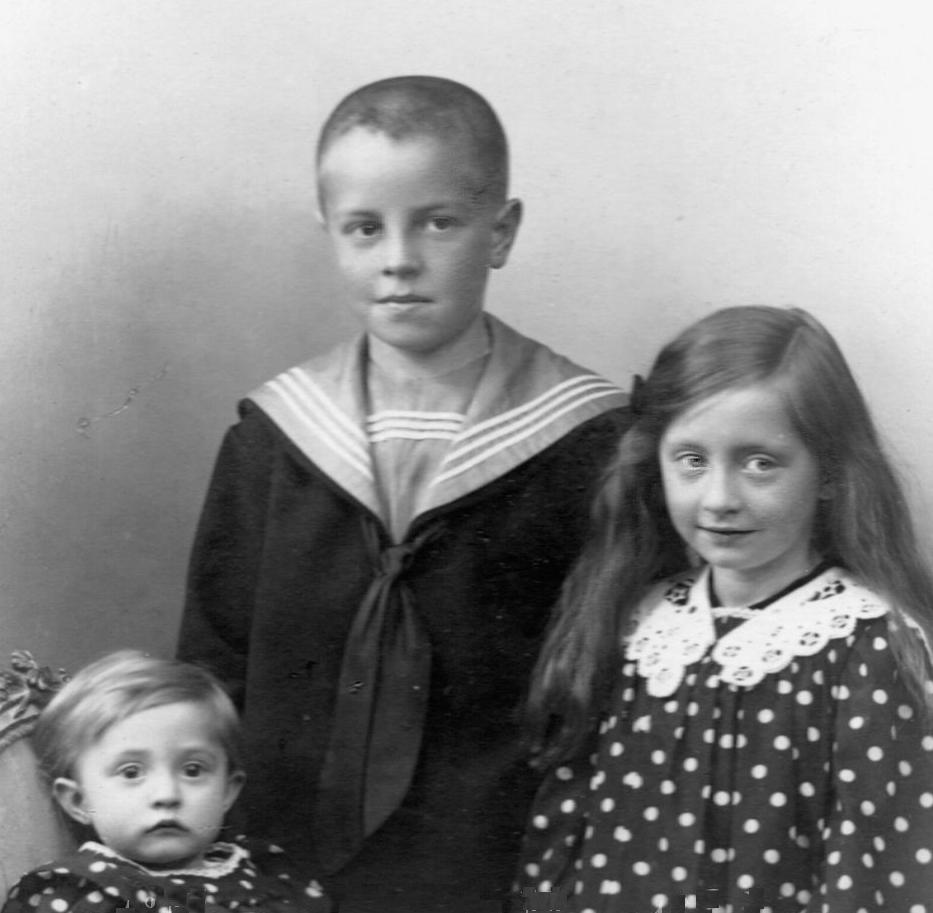 Here we see three siblings in a cabinet card portrait. The boy wers a traditional sailor suit and his sisters polka dot dresses. The chilsren are Willy - 10 1/2 years old, Karen 7 years amd Ella 17 months (figure 1). The portrait is undated but the nannow cabinet card format and grey color help date it to the early-20th century, we think the 1900s.