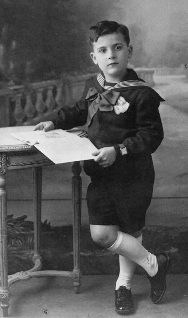 France, undoubtedly at the behest of his adoring parents. He is looks to be about 8 years old. He wears a short pants sailor suit with dickey (probably navy blue