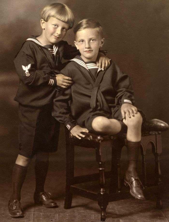 We see many American 8-year old boys wearing sailor suits from the time sailor suits became a major style into the the inter-War era. It was never the principal style worn by boys, but was a popular style, especially for boys from families in comfortable circuntances. we hace numerous examples archived on HBC. There is a famous portrait of the author Tom Wolfe wearing a dark sailor suit at age 7-8 in the early 1900s. We notice Harold Fitzroy-Carrington at about age 8 wearing a conventional sailor suit for play in 1906. Sailor suits were most common or younger boys, but we do see 8-year olds wering them. We note more boys wearing sailor suits a mud century, but after World War I we mostly see younger boys wearing them. During the inter-War era the oldest boys wearing sailor suits are about 8 years of age. We see some catalogs with offerings up tp 10-year olds, but the photographic records shoes that sailor suits were not very common for boys older thn about 8-year olds. We note a button-on short pants suit fora boy about 8-9 years old worn during the 1930s. After World War II we no longer se 8-year olds wearing sailor suits. This unidentitified colorized portrait of two brothers is undated. The boys look to be about about 5-8 years of age. We would say the portrait was probanly taken in the early-1920s, in part because of the low-cut oxfords which were not very common in the 1910s (figure 1). Notice that the younger boy has knee pants while his older brothers wear knickers.