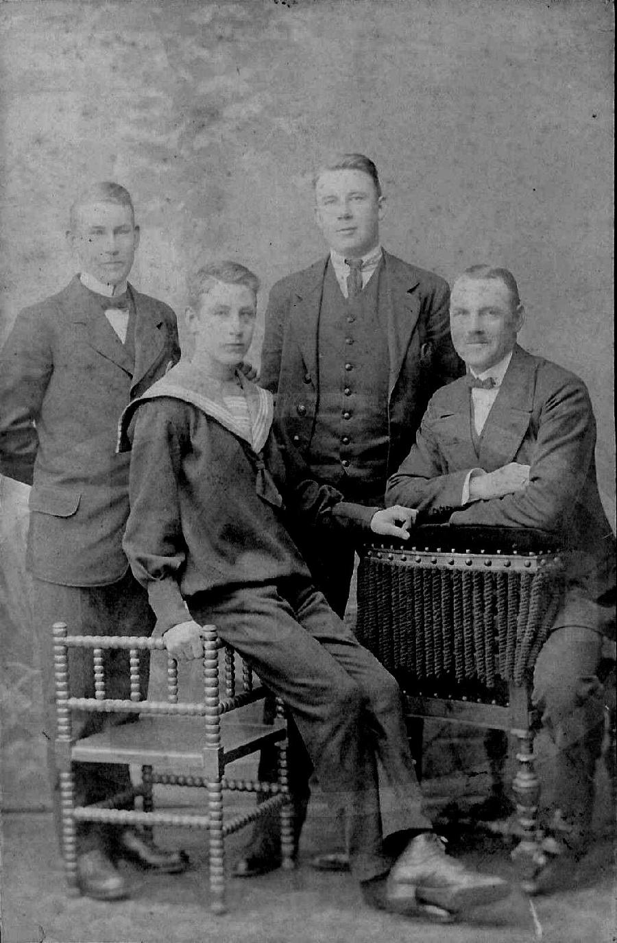 We do not see many American teenagers wearin sailor suits. Perhaps some younger teens wore them, but the phtographic record suggests that this was not very common. You can see that in the ages here for which he have linked pages. And this was the case at the peak of sailor suit popularity (1890s-1900s). We did not epect to find any older teens wearing sailor suits. Sailor outfits were popular for teenage girls, even older teens. But we do not see older boys wearing sailor suits. HBC has an extnsive American photographic archive and the photographic record clearly shows that the sailor suit was widely seen as an outfit for school-age boys, mostly pre-teens. We were surprised to find a family portrait with an older teen wearing a traditional sailor suit. We thought at first that he might have enlisted in the Navy, but we are not sure that the U.S. Navy had sailor collars with the detailing that the boy here is wearing. There is no information about the name of the family, ages or location. The boy looks to be about 16 years old.
