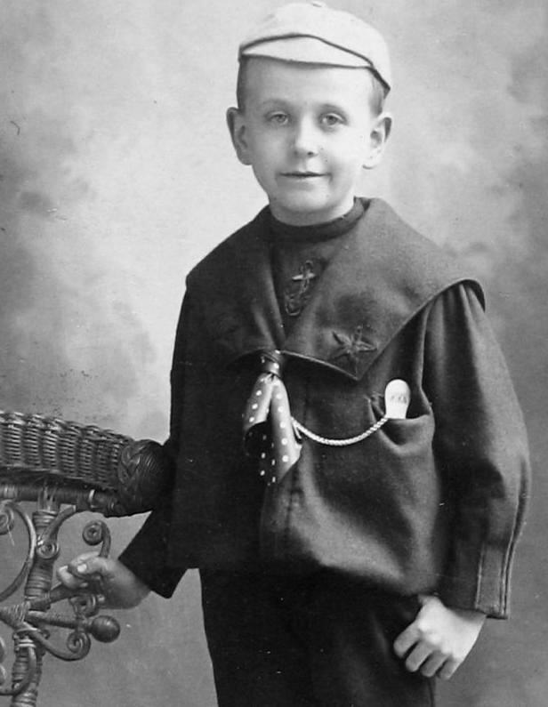 We see some boys wearing peaked caps with sailor suits. This was not a very common combination, but sailor suits and these caps were so popular around the rurn-of-the 20th century that we do see them being worn together. The images we have found seem to be primarily boys from affluent families that wore this combinatiuon. The portrait on the previous page is a good example. The imahe here has fewer social-class clues (figure 1). At the time the affluet class associations were not the case for the two garments when worn separately, but it does seem to be the case for the comnination. The peaked cap was associated with schools in Britain, but this was much less the case in America. Sone private schools did have these caps, but we also see boys attemnding public schoolls wearing them in the very early-20th century. Almost always this was a combinaion we note before World War I, Motly in the 1890s and 1900s, perhaps the early-1910s. We see sailor suits earlier. We also see peaked caps afterwards as well as sailor suits, but they were not worn together. The peaked cap after World War I became a kind of cap worn by boys from affluent families. They were worn by boys with suits or as part of private school uniforms.