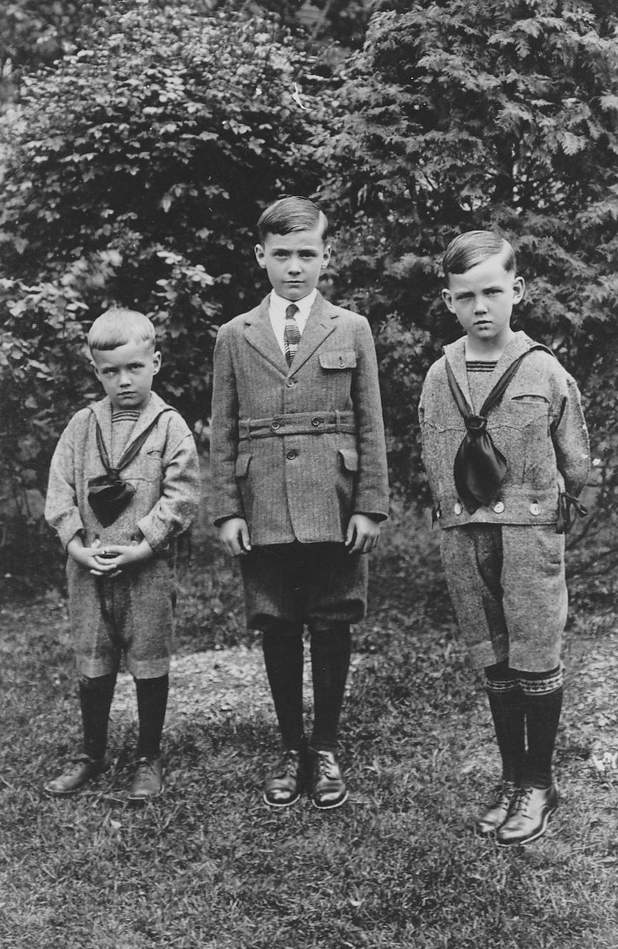We see many boys wearing button-on sailor suits. This was a style for younger boys. We see the suits done for pre-school boys up to about 10-years of age. Generally speaking, the sailor suits were done in sizes to about 8-years of age. The boys here look to be about 4-9 years old. The two boys wearing button-on sailor suits look to be about 4-7 years old (figure 1). By about age 9 years, nother had decided on a more mature lapel Norfolk jacket. We rarely see boys over 10-years old wearing these button-on sailor suits. Both the the button-on styling and the sailor suit were see as outfits for younger boys. We see sone slightly older boys wering sailor suits in the 19th century, but not by the 20th century. Most of the boys we see wearing these outfits are in the 3-8 year range.