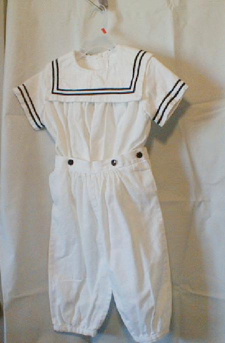 Although sailor suits have generally disappeared as boys wear, some suits were still available for younger boys on special occasions. Here a boy's size 5, white trimmed in navy blue 2 piece sailor-style suit with knicker-style pants. The pants and blouse have button-pn styling. The label reads Sir Alec, Dallas. This might be worn by a boy at a wedding or fior a special Spring "Sunday" outfit. Notably the detailonh has only two stripes rather than the traditional three stripes. We note that in the 1990s, companies ibreasinly offered sailored suits with knicker pants rather than shorts or longs. During th era when sailor suits were more widely worn, knicker pants were not very common.