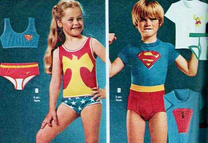 Underoos are not precisely a garment type, but rather a brand introduced by Fruit of the Loom with existing underwear types (T-shirts and briefs) done as costumes--mosdtly super-hero costumes. An Underoo set includes a matching top (usually a T-short) and bottom (usually brierfs). They were done for both boys and girls, but we believe they were more popular with boys. This needs to be confirmed. There were done as basically a costume for popular entertainment cgaracters. Super heros were especially popular with boys. They were also done with animated chaeracters and fantasy/science fiction. The super hero Underoos could mimic the distinctive costume of the character because many wore tights. Other underoos could not really effectively mimic the character's costume With these Underoos there was an image of the character and/or logo on the undershirt. Larry Weiss cane up with the idea for Underros (1977). He obtained the needed licenses for the four major comic character groups (D.C. Comics, Marvel Comics, Hannah-Barbera, Archie Comics). This provided the legal right to use Superman, Batman, Shazam, Wonder Woman, Supergirl, and Captain America among others. Weiss presented the idea first to Hanes, but they were not interested. Scott Paper company considered the idea. Fruit of the Loom finally seized upon the idea. They were already involved in some similar product lines. They produced blank underwear used to apply transfers. Fruit of the Loom approsached Weiss. Thus it was Fruit oif the Loom which purchased Underoos (1978). The company tested marketed Underoos in three markets, including New York City area. Market reaction was very strong andcthey decided to go ahead with production. We note Underoos in the Sears Catalog (1979).