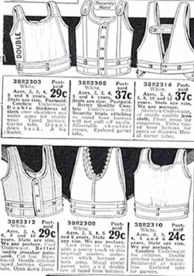 would be worn with the garment even if sold separately. But underwaists also had other functions such as the support of additional underwear, short pants, panties, skirts, etc.; remember that underwaists were sometimes called "pantywaists") The catalog ads for waists (or underwaists)--see the Stuart Co. waists or the later Wards waists (1923, 1929)--show various kinds