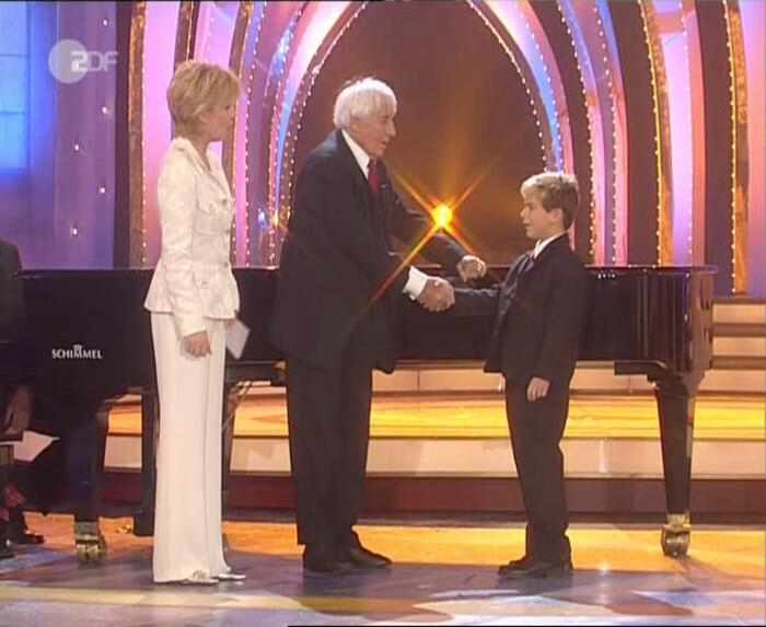 Figure 1.--Heer is an estemed German actor, Johannes Heesters, appearing on a television show with a moddern boy actor. We do not yet know if Heesters was a boy actor. |