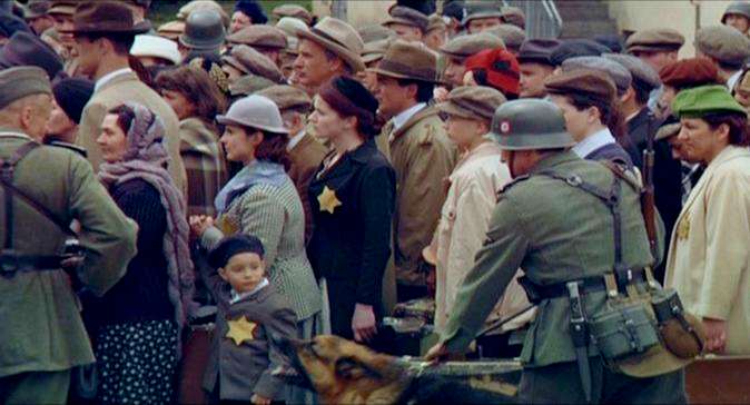 The film opens grimly with reminiscences of Auschwitz, the Nazi death camp, and some actual historical photographs of the skeletal victims. At one point we see the actual photo of four teenage Jewish boys who were victims at Auschwitz. Then there is a long sequence of German Jews, families with children, being loaded onto the cattle cars that will transport them to the gas chambers.