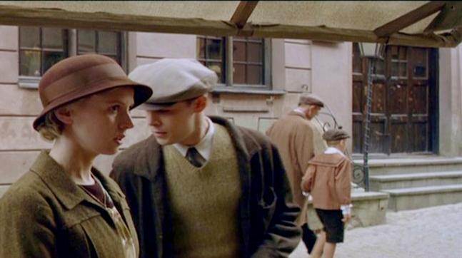 We see a little Jewish boy with his yellow star of David sewn on his jacket. In a scene with Hans and Ingrid shopping in the village near the Krautzenberg palace where they work we see in the background a Hungarian father and son walking past. The boy wears a rust-colored blouse with a sailor-style rectangular collar on the back of his shoulders. The blouse exposes part of his white shirt underneath. He wears short trousers, tan long stockings, and a flat cap typical of the style of boys' clothes in the Eastern Europe during the 1940s.
