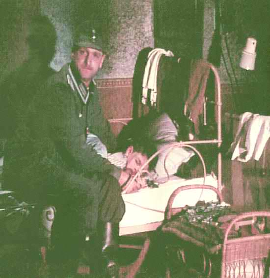 Figure 2.-- Later in the film the German soldier returns on leave from the front and discovers that his wife is having an affair with a woman. One scene shows the father sitting on the edge of the bed where one of his sons is sleeping. In the background, hanging over the head of the bedstead, is a Leibchen which the boy will wear the next day to hold his long stockings up. |