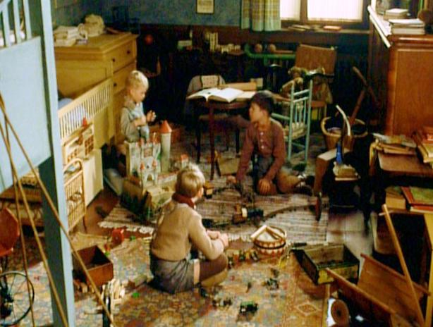 The costuming is very accurate historically. The housewife is the mother of several boys who are shown wearing long stockings in winter with their hose supporters showing under their short pants in some cases--once in a Christmas scene in which the children are playing with their toys on the floor and again at the Berlin zoo where they are playing outdoors with toy sail boats (figure 1 and click image). Later in the film the German soldier returns on leave from the front and discovers that his wife is having a lesbian relationship. One scene shows the soldier father sitting on the edge of the bed where one of his sons is sleeping (figure 2). In the background, hanging over the head of the bedstead, is a Leibchen which the boy will wear the next day to hold his long stockings up. It appears to be a white sleeveless vest-like garment to which four rather short hose supporters are attached, presumably two for each stocking. This is the closest I've been able to come to an image of the Leibchen, but it may throw a bit of light on the subject. The costuming also depicts the long stockings that German children still commonly wore.