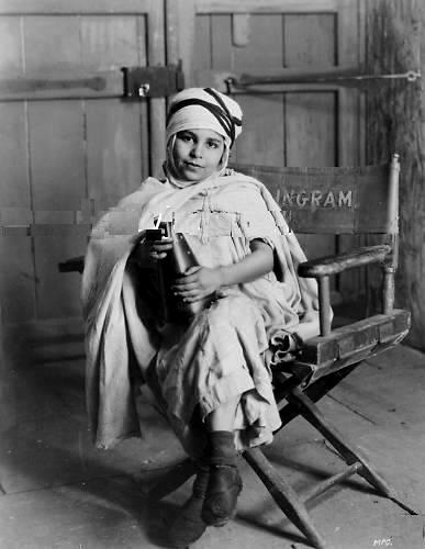 Cecil B. DeMille's "The Arab" was based on the stage play by Edgar Selwyn and very well known silent films. . It was an attempt to capitalize on heart throb Ramon Novarro's nlokbuster appearance in "The Sheik" (1921). Moroccan teenager Kada-Abd-el-Kader played an Arab boy in "The Arab". Here we note him sitting in director's Rex Ingram's chair on the set of the film in costume (figure 1). Kada after the shooting in I thik Morocco was actually adopted by Ingram and his wife Alice Terry who brought him to America. It seems that Kada was much older than represented to the couple and quickly started living the fast life in America. The couple as a result sent Kada back to Morocco where the fast life was a little more restricted.