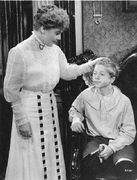 wore supporters to avoid looking so untidy. The falling stockings may be intended as an added bit of comedy to enrich Mickey Rooney's performance, but the effect seems historically inaccurate. In real life respectable middle-class parents would probably not have permitted so sloppy a look. Rooney was about 15 at the time, I wonder if it bothered him playing a much younger boy and wearing juvenile clothes.