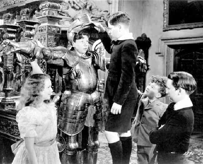 Beau Geste was a popular adventure novel by P. C. Wren. This was one of 33 novels and short story collections that Wren wrote, mostly dealing with colonial soldiering in Africa. Wren was British and his background was more with India, but he claims to have served in the French Foreign Legion. The title is French for 'Good Gesture', meaning something like 'gentlemanly gesture' It describes the adventures of three very close English brothers. The three Geste brothers are orphans raised in Brandon Abbas, a stately home, by their aunt Lady Patricia. The boys are brought up with English upper class values which were portrayed as long passed by time. Written after World War I, there is a wiff of blaming such attitudes on the War. The idea of 'the decent thing to do" is the central them tht the boys follow. The boys enlist separately in the French Foreign Legion following the theft of a valuable jewel (the Blue Water) from the country house of a relative. Suspicision falls on the brothers. Wren wrot the book in 1924, but set in the period before World War I. There re several screen adaptations. The first was a silent version (1926). This 1939 version was the forst talkie and stared Gary Cooper. The film begins ith the three briothers as boys. One of the brothers is played by a 14 year-old Donald O'Conner. They are English orphans taken in my an aristocratic family. The family has one girl and a bore of a cousin who appear with the brothers at the beginning of the film. Somewhat varied, but interesting costuming. The three brothers at times appeared in blue sailor suits. The two older boys wear longs, but the younger one has his pants legs rolled way up, they may be rolled up shorts, but it is hard to tell. The tattle-tale cousin is in a white sailor suit with shorts, but short white socks. The girl wears a white sailor suit dress, white knee socks and Mary Jane patent leather shoes. Subsequently the boys appear in suits and ties. The older boy wears knee pants buttons at the hem. The middle boy wears knickers. The younger boy wears a smart black suit with rather longish shorts, wide collar, and knee socks. The boorish cousin wears an Eton suit with longs. There is no real attempt to create period costuming, although perhaps the sailor suits for older boys might be a bit of an attempt. I assume the costuming must representative what Americans thought well-to-do English boys wore in the early-1900s. While knickers were common for Americans boys to wear. I think they were less common in Britain, alt least in the 20th cenmtury.