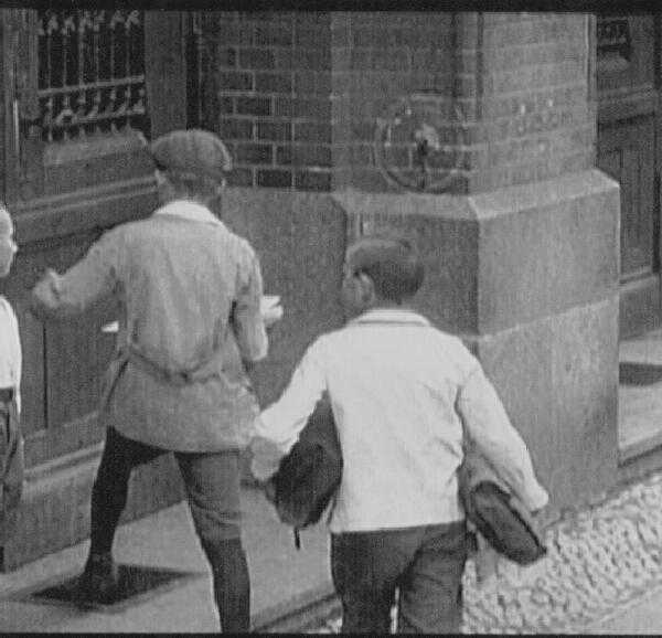 Figure 4.-- One of the most famous German silent films was "Berlin: Symphony of a Great City" released in 1927. A scene shows two boys entering their school for classes in the morning carrying bookbags. One boy wears a flat cap, a belted jacket, knee pants, and long black stockings.
