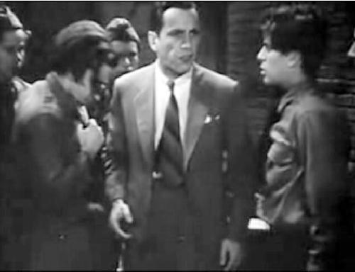 shoes during calisthenics. The warden summons him, front and center, and demands to know what the big idea is. Bobby expalins that his trousers are too big in the waist, and the warden's solution is to send him to the cook to be fattened until the trousers fit! Fortunately for Bobby, Humphrey Bogart is listening to all this, and tells the warden to "make the pants fit the boy, not the boy fit the pants."