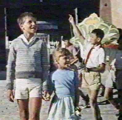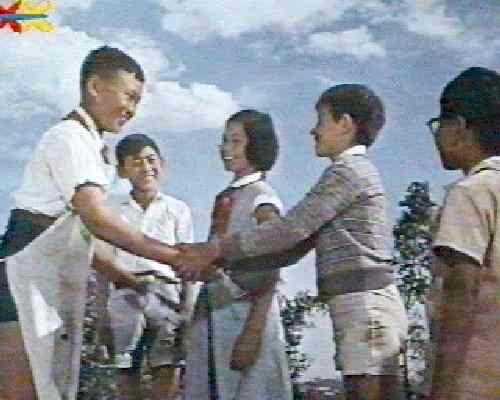 Figure 4.--The Chinese and French boys work together here to get their kite aloft. |