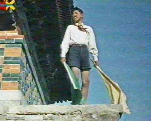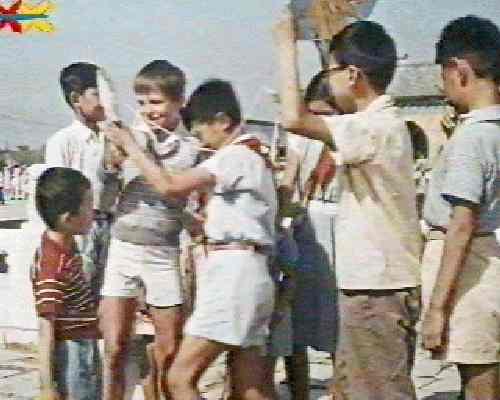 The Young Pioneer uniform appears to be a blue Mao cap, white shirts, red kerchiefs, and blue short pants. Some boys wear white shirts and kerchiefs, but with other colored shorts. Other boys wear their red kerchiefs with other colored, presumably non-uniform shirts.
