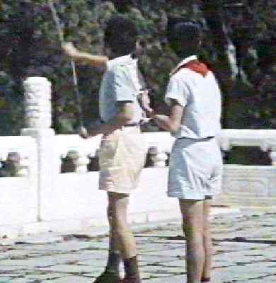 Almost all the Chinese boys I see wear short pants. The length of the shorts on the French and Chuinese boys is quite similar. The colors seem to be mostly blue, white and Khaki. Notice the khaki pants now so popular in the United States were originally "chinos" because the khaki/tan material made in China was sold in the Unted States. Apparently khaki in the 1950s was still popular in China. HBC notes only one Chinese boy wearing long pants.