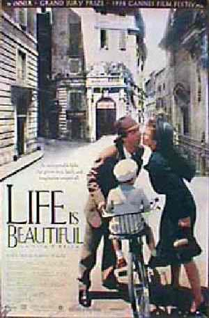 The aclaimed Italian filmbegins as a light, fluffy comedy. Sudently it becomes the wrencing, deeply moving tale of a irrevent father's love for his wife and son, inprissoned in a NAZI concentration camp. The plot centers around the father's attempt to disguise the horrors of the Holocaust from his son. When the boy asks why a store posts a sign forbidding entrance by Jews and dogs, Guido laughs it off, suggesting they post a sign on their own shop, restricting entrance to "Visigoths." Some reviewrs write, "Laughing in the face of adversity is the best way to triumph over it." Personally I think the film rather trivializes the Holocaust. It ceratinly was a beautifully made movie. The costuming appears very accurate. My problem with the film is the premise, that the evil could be hid from the children. First children are not that stupid. Second, it reduces the enormity of the crimes involved. Small children in the camps were in fact kept with the mothers and along with the elderly were the first to be murdered. The boy wears a romper suit and matching peaked cap with strap shoes and white ankle socks. I'm not sure how common such outfits were in 1940s Italy. We know they were popular in France at the time, but we have less information on Italy. Directed by Roberto Benigni. The cast included: Roberto Benigni, Nicoletta Braschi, and Giustino Durano. The boy, Giosué Orefice is played by Giorgio Cantarini.