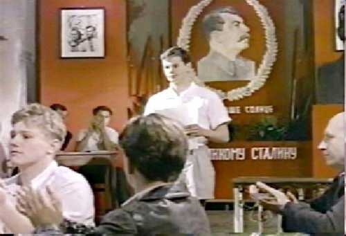 The first photograph is from the section of the film when "Solly" escapes to Russia (the Soviet Union) and joins the Komsomal, the Communist Youth Organization. Here we see the Komosol youth directing younger boys in the Young Pioneers. The uniform shown is white shirts with red neckerchiefs and short pants. The children are depicted as wearing a very standardized uniform similar to that worn after World War II, We are not sure how accrare this depiction is for 1940. Some of the boys wear knee socks, others wear long stockings. This photograph shows younger boys, but the same uniform was worn by boys as old as 16 and 17, and the older boys, as shown in the film, wear both knee socks and long stockings.