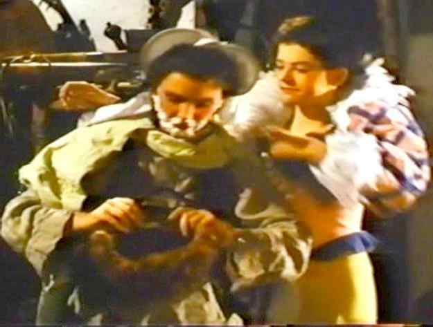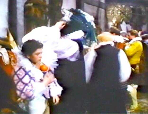 At the time, it was not considered appropriate for women to make public appearances such as on the theater stage. Thus boys were needed to play the female parts. The boys who play the women's part and the presenter are only middle teenagers or perhaps even younger. The boys who played young women on the Elizabethan stage had mostly been trained in the great choir schools of the period and were talented musicians as well as actors. They had to be able to sing trebble songs in comedies such as "Twelfth Night". But we must remember that boy's voices remained soprano longer in Elizabethan times than they do now. Modern diet and other factors make boys' voices change earlier now than was true in the 17th century. Other scenes in the Olivier production show boy actors getting dressed for their female parts behind the stage. The boy in the first image is stuffing an orange into his bodice to make himself appear to have breasts. He is apparently preparing himself for the role of Princess Katherine, the daughter of the King of France whom Henry V marries at the end of Shakespeare's play. In another scene we see two boy actors helping each other to get dressed for the stage. The boy who is to play Mistress Quickly, the female associate of Falstaff at the Boar's