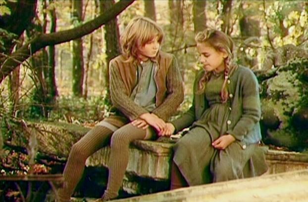 The film is very interesting for its diverse costuming details. Rainbow-maker, the chief boy of the story, wears a pullover sweater, short trousers (sometimes lederhosen), and very long woolen stockings obviously supported by a Leibchen. In one of the scenes we see the children playfully undressing each other to reveal Marie wearing the typical Leibchen with four hose supporters that were characteristic of children's underwear (boys' and girls' alike) during the 1950s in the GDR. Marie wears a peasant dress and also brown stockings except in the scenes where she metamorphoses into a kind of virginal princess dressed all in white (complete with white long stockings). The images attached give a good idea of the children's costuming. The first image