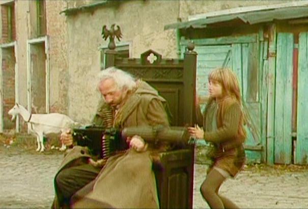 The title is "The Land Beyond the Rainbow" ("Das Land hinter dem Regenbogen"). It was written and directed by Herwig Kipping in 1991 and is much admired in film circles as a harsh but at the same time beautiful attack on the Communist regime in East Germany during the year 1953, the height of the Stalinist repression. East German workers rioted in Berlin during 1953 and were brutally suppressed by the Soviets and East German Communist autorities. A HBC reader tells us, "I went to a lecture by a German film historian who grouped this film with others as belonging to the GDR period [IU festival], so I took his word for it. I checked on the making of this film. Since the script wasn't actually written until 1991, I guess you must be correct about the actual making. I suppose what the lecturer I heard was implying that the director and author had the idea for this film quite a few years earlier when he still lived under Stalinist control of East Germany, and savage criticism of GDR politics, economy, and morals is emphasized in the film. So while the film was released in 1991, the author had been working on the ideas expressed here in 1986 while the Stasi still controlled GDR film making. I think the lecturer may have classified it as an EAST German film because it was made at the Deutsche Film-Aktiengesellschaft (DEFA) studio with DEFA personnel, but after STASI controls had disappeared. I believe he felt that his artistic life was much threatened by the Communist dictatorship that controlled all films in the GDR before the Wall fell. It is interesting that the story of the film is set in 1953 at the height of Stalinist ideology in the eastern part of Germany." A reader tells us, "I read a book on the films of this period and the writing of the script for The Land Beyond the Rainbow was not finished until 1991, so they couldn't have started shooting earlier than that year. But I think the gestation of the film in the mind of the director had begun before the wall came down. You are quite right. The Stasi would never have permitted a film so harshly critical of the regime if they still had control of the film industry."
