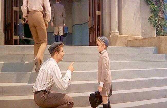 Figure 1.--This boy wears a short pants suit with knee socks and a schoolboy cap. This is a style that is much too late for the period being dramatized and for that matter not likely for Iowa even later. But of course historical realism is hardly the point in splashy American musicals. A knickers suit would have been much more likely st the time. In Iowa even later in the 1920s and 30s, a knicker suits and a flat cap would have been much more likely even for the younger boy. |