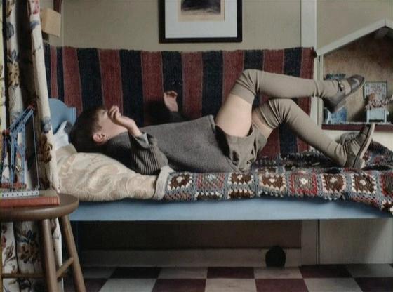 Nils wears short pants and long stockings. The movie costuming seems to follow that shown in the charming illustratins from the book. Like Peppi Langstrumpf (Longstockings), Bertrand is wearing long stockings even if the action is taking place in the 70s when no boy or girl were any longer clothed like that in Sweden. A French Canadian reader writes, "Nils' clothing are exactly like those i wore in the 1940s. His short pants are just over the knee and his stockings are ribbed like those boys worn in Scandinavia or Germany until the 1950s. Something strange: the stockings are held up by nothing. The result is that stockings are always pulling down under the knees. No boy or girl wore their stockings without a suspender or at least rubber bands. His wool sweater is really beautiful. I don't like the illustrations in the book even if the clothing are realistic. A reader writes, "I think the modern style knitting is why the stockings are being held up by