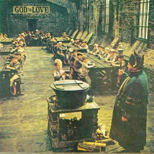 tables and benches because it was supposed to be the dinning hall were the orphans ate their food. Written on the wall was God is Love. The scene being shot was Mr. Bumble singing the grace said before meals. There were several takes before Carol Reed was satisfied that the scene was in the