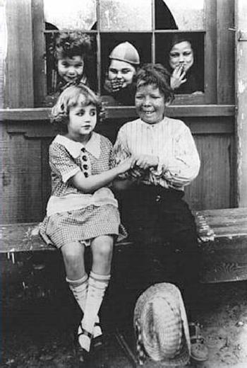 HBC is unsure as to how the children in the "our Gang" films were costumed. Unfortunately we have no details at this time on just how the productions were costumed. This would be interesting information to have and we would be interested in what readers might know on the subject. These were fairluy low budget productions. As far as I know there was no wardrobe costumer n the production staff. Some pf the children wore rather ragged clothes, but as they were well paid for their acting this had to be costuming. They did not receive really high salaries, but it was enough to support the families involved. We suspect that the parents may have been general instructions on how to dress the children. They were dressed up for some scenes or had characters who might be dressed up. Some of the fancier clothes may also have been costumes. But often they wore clothes that seem similar to what average kids were wearing at the time. We suspect that many of the children came to the shoots in their own clothes and that they were costumed only if the plot required some kind of garment or special look. Some instructins may have developed if the children showed up in something inappropriate. The sandals Mickey Daniels here is wearing may be such an example. Although a reader reports that Spanky sometimes wore sandals. He tells us, "I have seen Spanky wearing single bar t-strap sandals." I don't think this was very common, but it has been some time since I have seen the series.