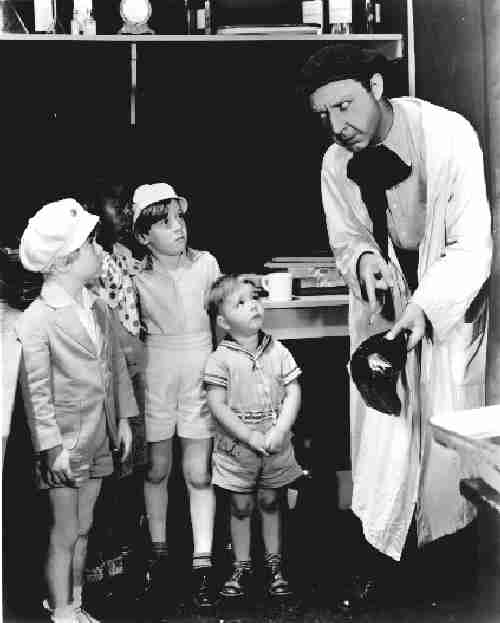 One of the most instantly recognizable movie features of the 1930s are the Our Gang shorts. These productions are fascinating glimpses into American children's clothing for morethan two decades (1922-44). Some of the episodes even work the clothing into the story line. They were produced by Hal Roach, first on his own and then with MGM. The "Our Gang" children supposedly arrived at the studio at 8:00 am and went home at 5:00 pm. The studio claimed that they were all in bed by 8:00 pm. The children attended the "Gang School House" run by the famed Mrs. Carter. Roach later commented on the Our Gang series, saying that "They were a special kind of child. Today you would have to have a contest to find one like them. They talked and acted exactly like children really do. And that's what made "Our Gang" so popular." The boys were Alfalfa (Carl Switzer), Buckwheat (William Thomas), and Spanky (George McFarland. Others included Dickie Moore, Jackie Cooper, Bobby Blake (then billed Michael Gubitosi). George continued in the series until 1942, 2 years before it ended. Also see Little Rascals. Our Gang used to be a TV staple, but today is rarely seen. HBC is unsure as to how the children were costumed. They often wore rather ragged clothes, but as they were well paid for their acting this had to be costuming. Some of the fancier clothes, howevr, could have been clothes they actually wore.