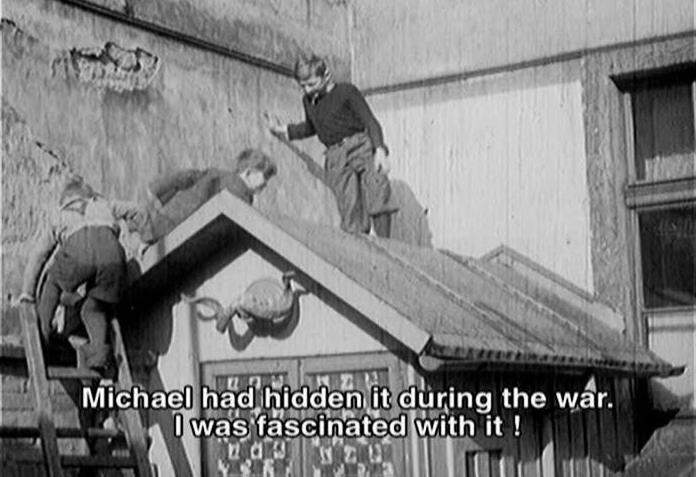 One of the eight episodes, entitled 'Small Russian Clouds of Smoke' follows the fortunes of the Popov family, who were Czarist Russian emigres to Czechoslovakia, having fled from the Bolshivek revolution. They never fully assimilated into Czech culture, failed to learn the language, and tried to maintain their Russian culture in a strange land. The family and their friends spent much of their time in a Bohemian summer resort, Kologeje, where some of of the most interesting footage was shot. One image shows a carousel where children in that town are having fun. Notice the boy in the foreground, about 12 years old, who is wearing a short-trousers suit with a Schiller collar and white long stockings. This episode dates from the early 1920s. A later shot, taken in the early 1940s, shows a 5-year-old boy of the Popov family with a girl passenger riding his tricycle and wearing H-bar shorts with tan long stockings.