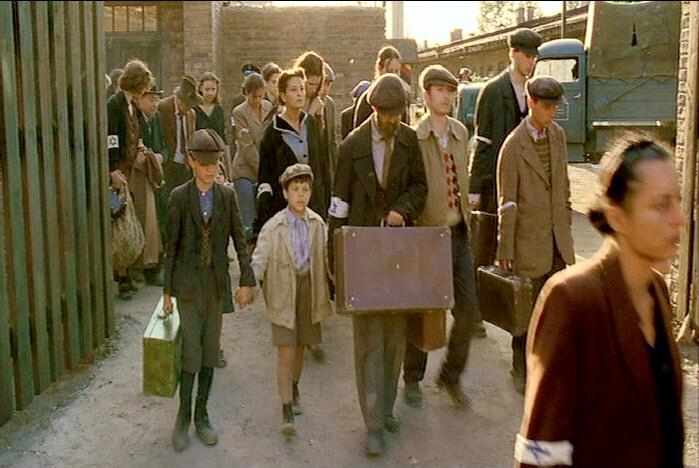 brutality of the NAZIs, but it was filmed with meticulous historical accuracy including the costuming. In numerous scenes we see boys dressed in the style of 1940s Warsaw. Most of the boys wear various outfits with short trousers and long stockings. Here we see two boys entering the Warsaw Ghetto when it was first established (figure 1). The Jews were told tht they were being resettled in the East. The boys wear black and brown long stockings with short trousers. Notice their typical flat caps.
