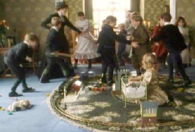 The costuming is realistic, suitably Edwardian. The boys wear either knee pants or knickers, both with long black stockings. In the play scene, the boys wear either knee pants or knickers with long black stockings. Throughout the film, Peter wears knickers but rather tight knickers that do not blouse--very