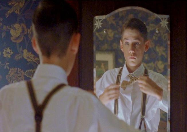 period, his dress-up suit is worn with suspenders, which many boys wore during