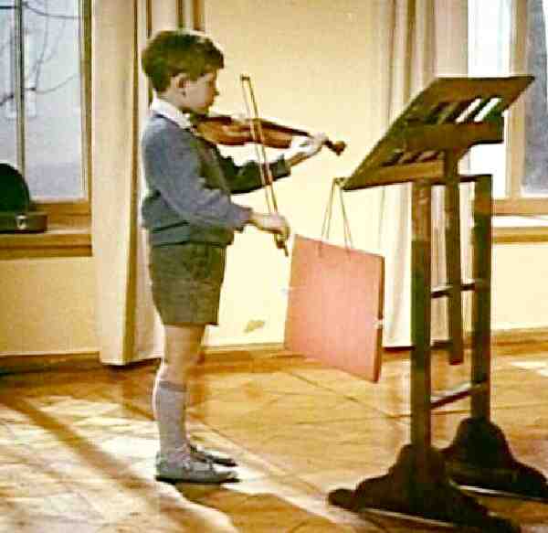 Sasha appears in different outfits and thgere are other boiys depicted in the film. Throughout the film, Sasha wears short pants and patterned knee socks with sandals. Sometimes he wears a blue pullover sweater. Here we see Sasha playing the violin at his music lesson (figure 1).