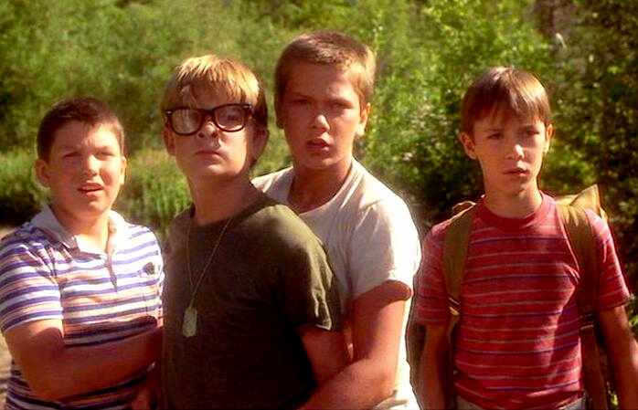 The costuming seems true to the 1950s. The bys wear stripped "T"-shirts, Keds and jeans. The costuming was fairly accurate for that period of time and the location depicted in the film. River Phoenix' attire was probably the most common clothing worn by boy teenagers. Generally younger boys wore stripped "T" shorts and teen agers more commonly wore the white ones. Blue Jeans were enormously popular, preferably Levi 501’s, with rolled up cuffs. A plain white tee shirt, and like River did, you would roll your cigarettes up in the sleeve. A teenagers dressed like this would have veen seen by some as a budding juvenile delinquent. Which is the way some saw River's character because of his family background. The black and white tennis shoes would probably have been either U.S. Keds or P.F. Flyers. Both were equally popular. It was kind of interesting that canvas shoes didn’t become popular until World War II at which time leather shoes were rationed in the U.S. Boys became accustomed to wearing tennis shoes and the popularity carried on. Wil Wheaton’s clothing was just about as accurate. Striped tee shirts were commonly worn by younger boys. The faded and patched blue jeans would have commonly been worn for everyday play clothes. The all white tennis shoes would probably have been P.F. Flyers, as almost all of the U.S. Keds were black and white. Jerry O’Connel’s khaki trousers would have been a little less common than blue jeans. His striped polo shirt would also have been less popular than a plain white tee shirt. Printed tee shirts didn’t really become popular until a few years later. The white canvas deck shoes, while not unheard of, were not very popular with youngsters. Corey Feldman’s costume would have been completely unconventional for that place and time. Part of his character was that he emulated his father, who he made out to be a war hero, hence the olive drab tee shirt, black denim trousers and military combat boots. He even wore army dog tags.