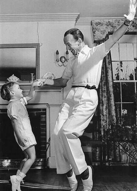 photo of Fred Astaire with his son Fred Asaire, Jr., time frame early 1940s. If you live near a good library, you might want to try to find the Aug 25 1941 issue of Life Magazine, which has a similar but different picture of Astaire Sr. and Jr. on the front cover." We think our reader may be correct here. This looks more like a photograph taken by a skilled photographer than a scene from a movie.